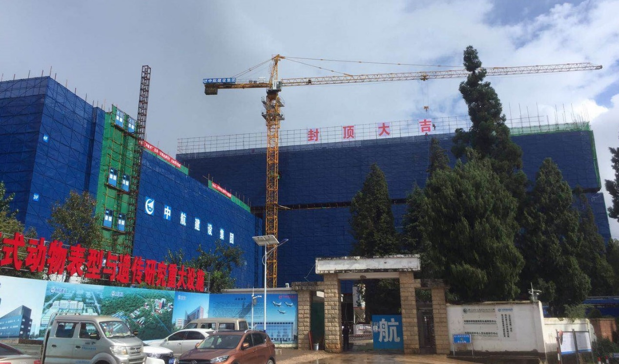 2020年9月23日,在中国科学院昆明分院院长周杰、中国科学院昆明动物所所长姚永刚等项目相关单位领导及代表的共同见证下,伴随着最后一方混凝土的浇筑,由中航建设集团承建的中国科学院昆明动物研究所模式动物表型与遗传研究国家重大科技基础设施(灵长类设施)项目-P3综合实验设施大楼顺利封顶,标志着该项目取得阶段性成果。