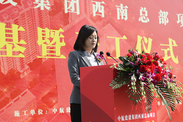 新都区副区长彭茚对西南总部开工表示热烈祝贺。她表示项目开工是双方合作共赢的良好开端,期待在更宽领域、更深层次开展合作,共谋新发展、共创新辉煌!新都区将一如既往地为项目建设和企业发展营造优越环境、提供周到服务,力争把中航建设集团西南总部建设成为航空产业总部经济的标杆!